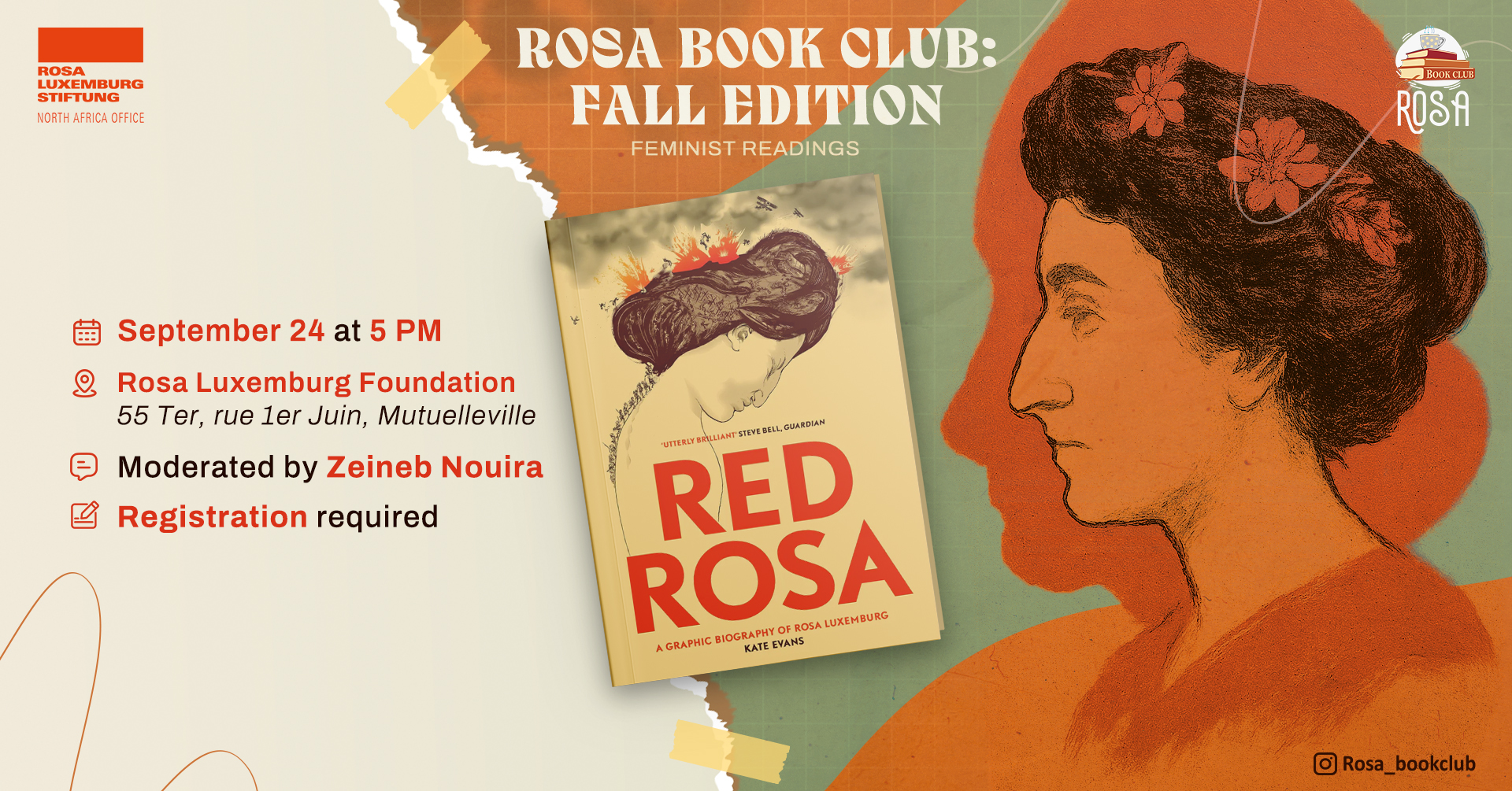 Club de lecture autour du roman graphique Red Rosa de Kate Evans, organisé par la Rosa Luxemburg Stiftung – North Africa.