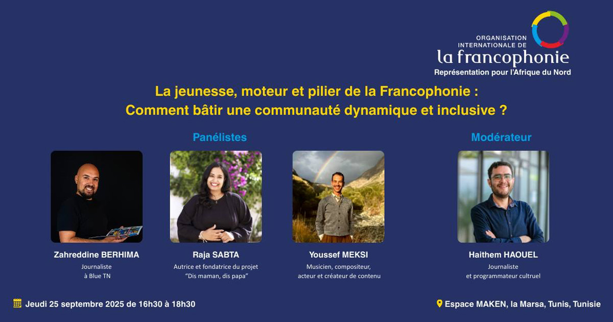 Le 25 septembre 2025, la Représentation de l'OIF pour l'Afrique du Nord (REPAN) organise une conférence-débat intitulée « La Jeunesse, moteur et pilier de la Francophonie : Comment bâtir une communauté dynamique et inclusive ? ».