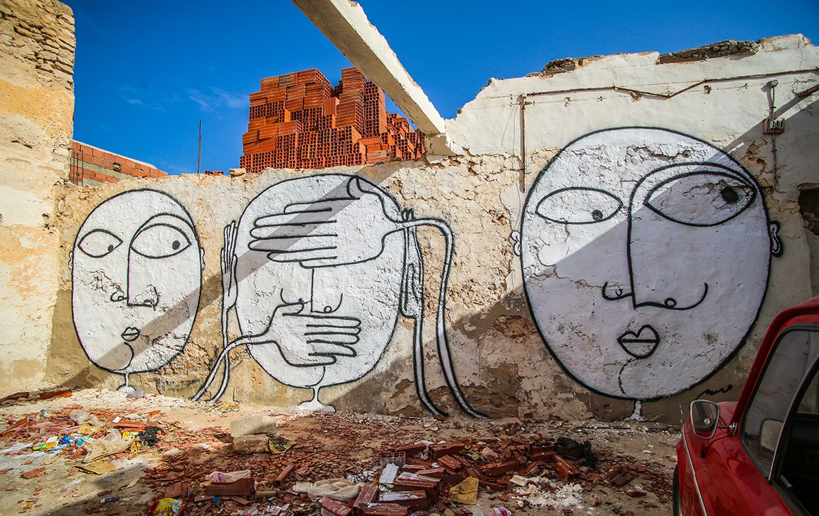 Parmi les œuvres présentées à Elyssa, le projet Passe-muraille illustre parfaitement la démarche de Wissem. Inspiré par l’art urbain, il consiste à intervenir sur les murs et façades de bâtiments, transformant l’espace public et révélant des dimensions insoupçonnées de notre environnement quotidien. Le personnage des Grosses têtes, véritable signature de l’artiste, apparaît dans ces lieux inattendus, réinventant le quotidien et offrant un face-à-face inédit avec l’art.