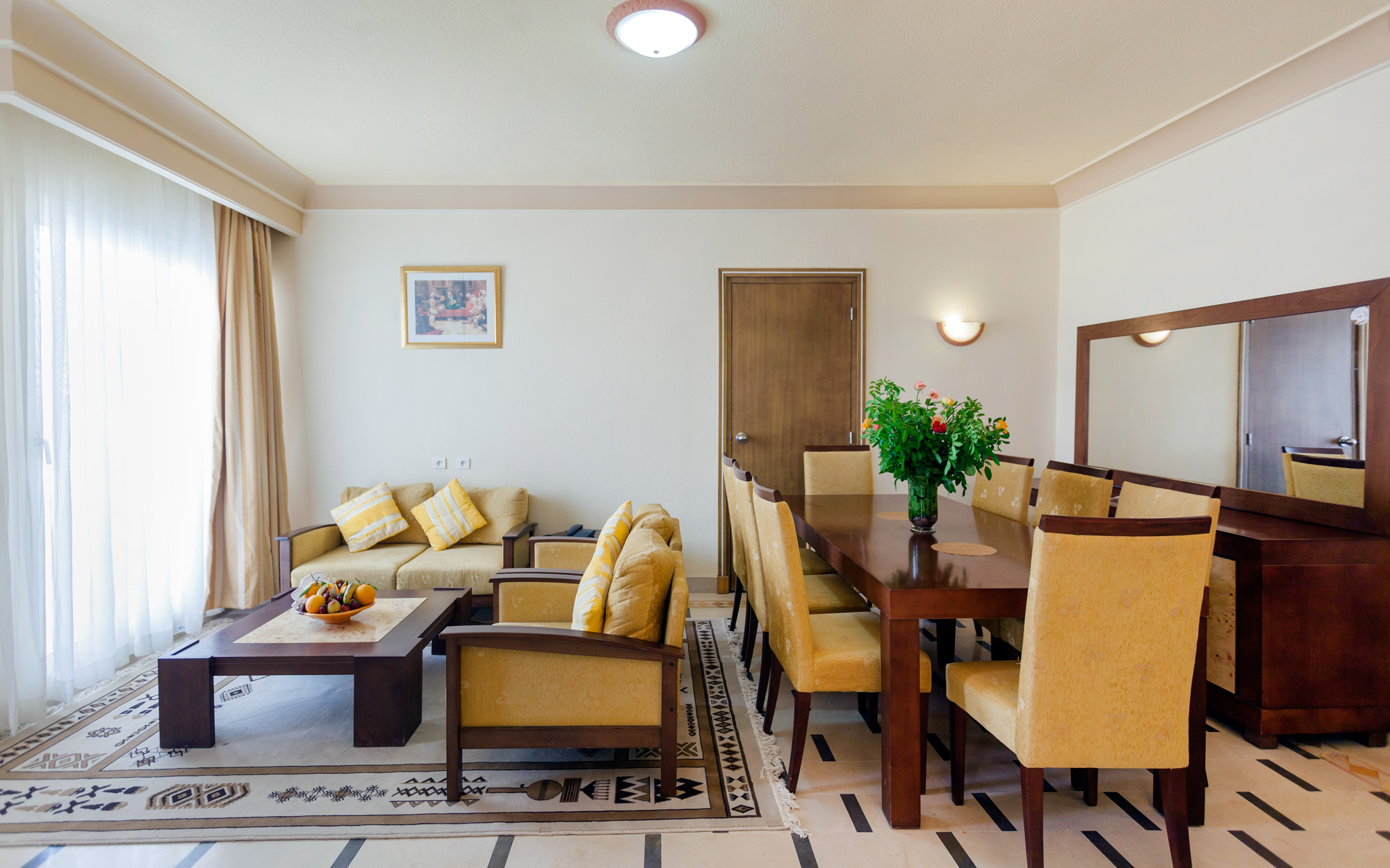 L’hôtel compte 156 chambres doubles, 23 suites et une suite présidentielle, toutes climatisées et offrant de magnifiques vues sur les dunes, la piscine ou le jardin.