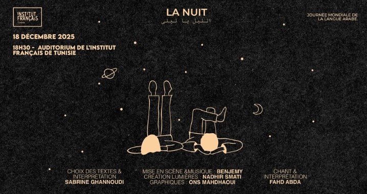 Cette semaine du 17 au 21 décembre 2025, l’agenda culturel réunit les JCC, Tango arabe (17 décembre), La Nuit (18 décembre), Atelier de calligraphie arabe avec Noura Mzoughi (18 décembre), Hot Club Jazz TN (19 décembre), Méditations poétiques (20 décembre) et Mélodies andalouses (21 décembre 2025), entre musique, poésie et arts au cœur de Tunis.