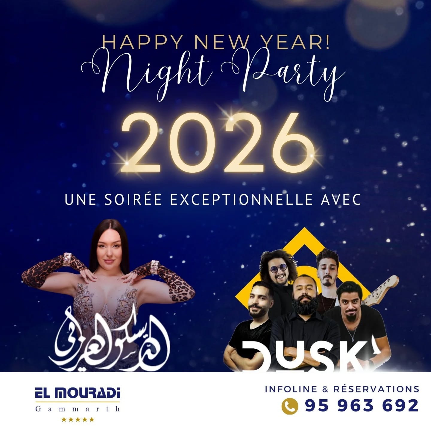 À El Mouradi Gammarth 5*, la soirée du réveillon sera rythmée par le spectacle « Al Disco Al Arabi », animé par DUSK Live Band, pour une ambiance festive et moderne.