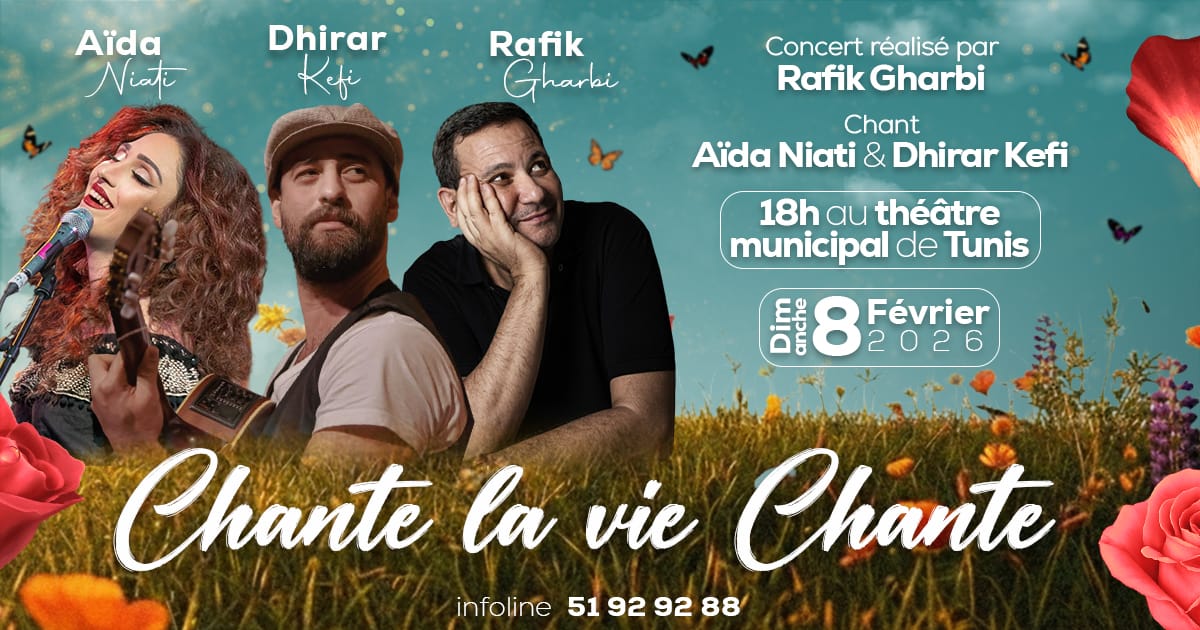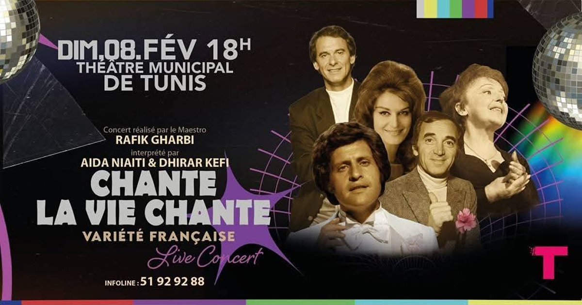Le maestro Rafik Gharbi revient avec un nouveau spectacle « Chante la vie, Chante » qui aura lieu le 8 février prochain au Théâtre municipal de Tunis. Il sera entouré sur scène de deux artistes de renom : Aida Niati et Dhirar Kefi ainsi que d’éminents musiciens pour un concert de variétés françaises célébrant les grands succès des années 60, 70 et 80. Au programme, des tubes rythmés et intemporels de Michel Fugain, Joe Dassin, Dalida, Edith Piaf, Julio Iglesias et bien d’autres. Ce nouveau rendez-vous est une continuité des spectacles d’hommage au chanteurs francophones célèbres, après le succès du spectacle « Hier encore » pour le centenaire de Charles Aznavour puis « Gigi et la Môme » autour des tubes de Dalida et Edith Piaf.