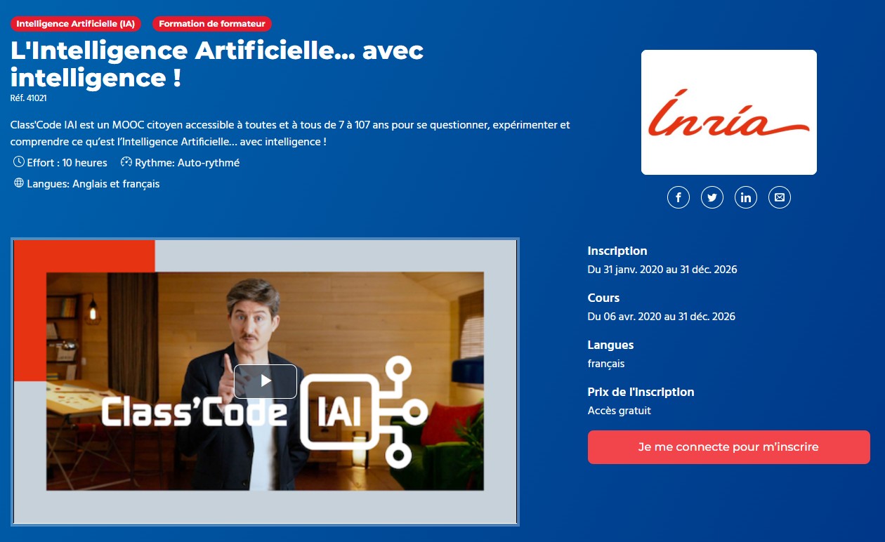 FUN-MOOC propose un cours citoyen intitulé « L’Intelligence Artificielle… avec intelligence ! », destiné à un très large public incluant le grand public, les enseignants et les jeunes apprenants. Ce MOOC, d’une durée d’environ dix heures, adopte une approche pédagogique et ludique pour expliquer les grands principes de l’IA. Une attestation ou un badge peut être obtenu à l’issue du cours.