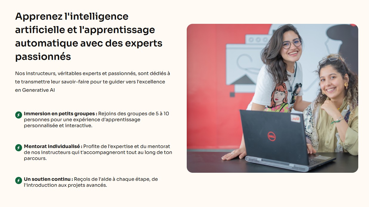 GoMyCode propose une formation d’introduction à l’intelligence artificielle dispensée à distance sur une période de douze semaines, à raison de quatre heures par semaine. Ce programme, dont le coût est d’environ 600 dinars tunisiens, s’adresse principalement aux débutants disposant d’un diplôme de base. La formation couvre les principes fondamentaux de la science des données, notamment l’utilisation de Python, la visualisation et la préparation des données, ainsi que les bases du machine learning, incluant les algorithmes supervisés et non supervisés. L’inscription se fait directement via le site officiel de GoMyCode.