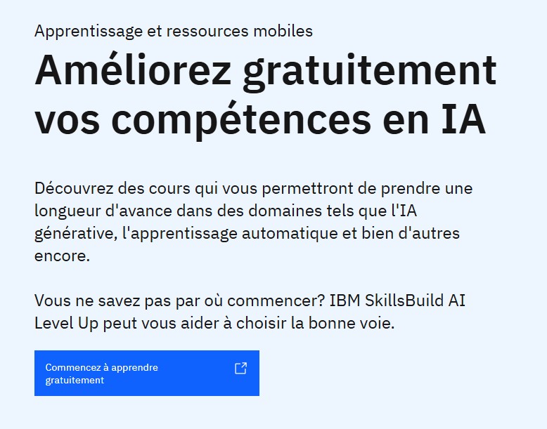 La plateforme IBM SkillsBuild propose plusieurs cours gratuits consacrés à l’intelligence artificielle, chacun d’une durée relativement courte. Ces formations permettent de découvrir les concepts fondamentaux de l’IA ainsi que certaines applications de l’IA générative. Elles sont ouvertes à tous les publics, sans exigence de prérequis technique, et accessibles via le site skillsbuild.org.