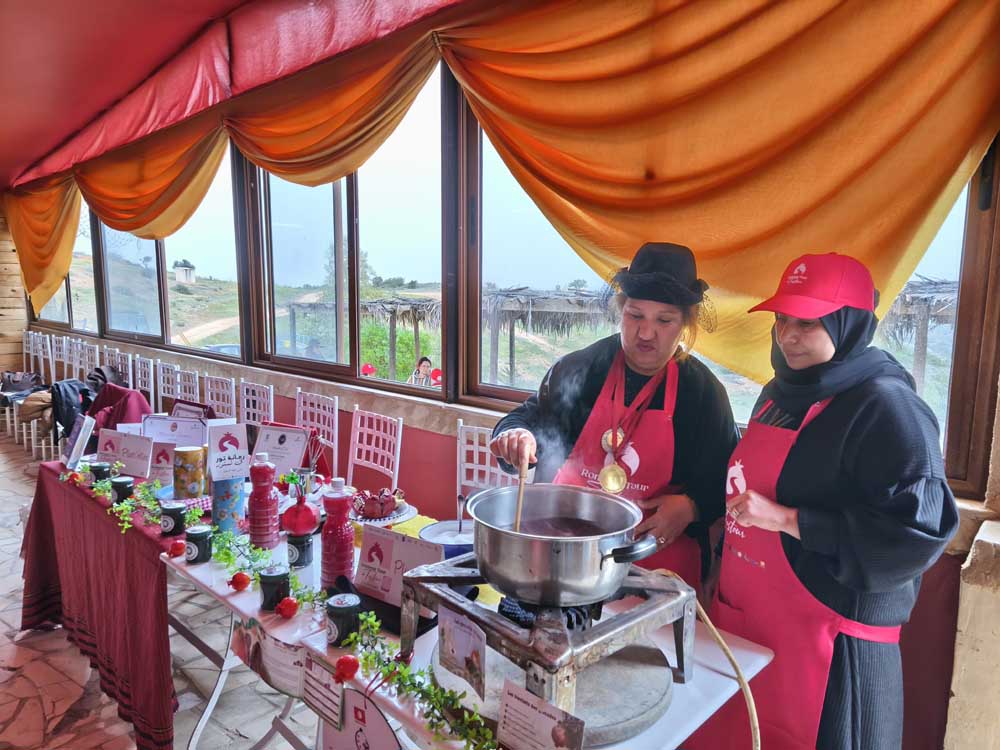 Le parcours s’est poursuivi avec des ateliers de transformation et de valorisation de la grenade, conçus comme de véritables moments de transmission et d’échange. L’atelier de préparation de jus de grenade « Jollanar » a permis de découvrir les méthodes de pressage et de valorisation du fruit frais, tandis que l’atelier de préparation de la gelée de grenade organisé par le groupement de femmes « Pluri’Elles » a mis en lumière les techniques artisanales de transformation en produits dérivés à forte valeur ajoutée. L’atelier culinaire de la « Rechta Hlowa », animé par Bit Lmouna un deuxième groupement de femmes, a offert une immersion dans le patrimoine gastronomique de Testour à travers une pâtisserie traditionnelle emblématique, révélant le lien étroit entre cuisine, mémoire collective et identité locale.