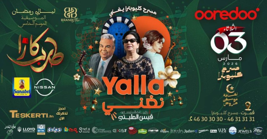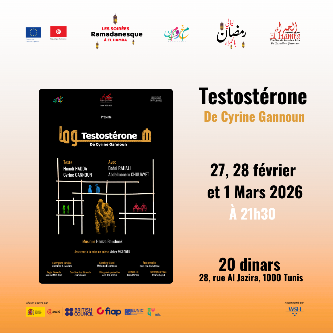 Cette semaine, du 27 février au 5 mars 2026, la scène culturelle tunisienne s’illumine avec une série d’événements variés : le théâtre avec Testostérone (27 février, 28 février et 1er mars), Deux sœurs deux arts : Pâtisserie et peinture (27 février), et le spectacle « Sinouj » d’Ahmed Benjemy ; la musique avec Cheb Mami (27 février), le Nabil Abdmouleh Quartet (27 février), le Quintet Aytaç Doğan (1er mars), Abdelkarim Basti - « Oshaq Al Tarab » (2 mars), Ahmed Jelmam - spectacle soufi (3 mars), le Chœur de chants grecs de Tunis (4 mars), Tunis Tango Arabe (5 mars), le lancement du Festival de la chanson tunisienne (5 mars) et Amine Radi - « La Suivette » (5 mars), offrant aux amateurs de théâtre, musique et danse un panorama complet et dynamique des arts à travers le pays.