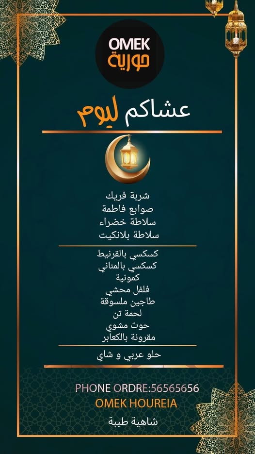 Petit restaurant de quartier à l’ambiance simple, proposant une cuisine tunisienne traditionnelle. On y déguste des plats réconfortants (couscous, tajines, bricks maison, etc.) préparés dans la pure tradition locale. Un menu Iftar tout-compris est proposé à environ 43 DT, idéal pour une rupture de jeûne simple et conviviale.