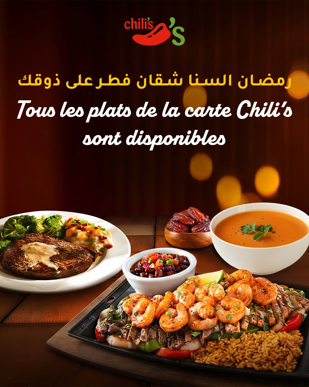 Chaîne tex-mex américaine très répandue en Tunisie. Ce restaurant familial sert burgers, fajitas, ribs et plats mexicains dans un décor festif. Un menu Iftar spécial est disponible (entrée + plat + dessert) pour environ 49 DT, permettant de rompre le jeûne dans une ambiance détendue et internationale.
