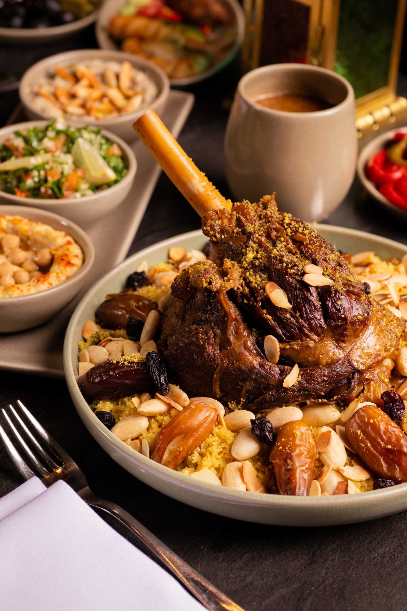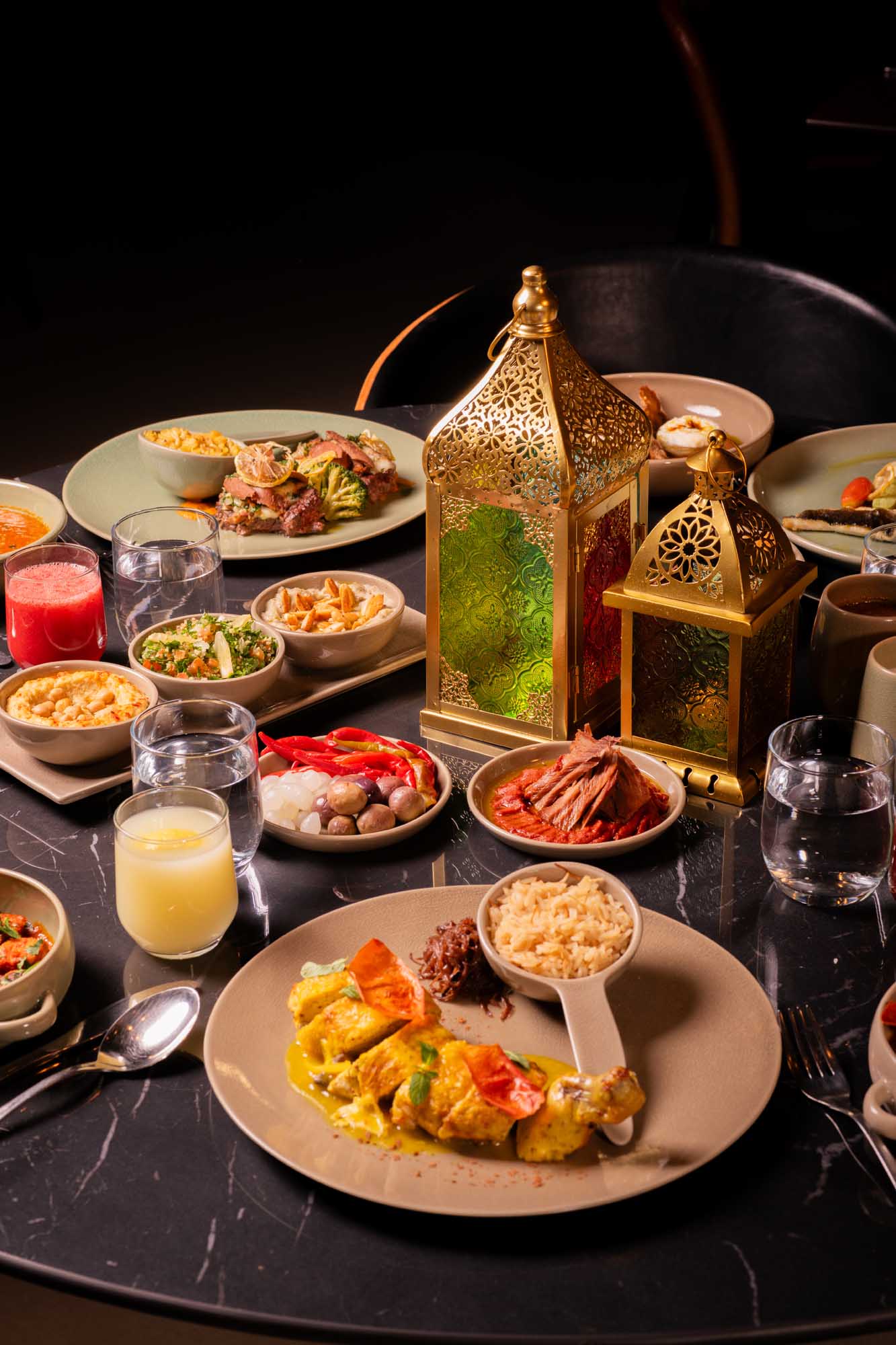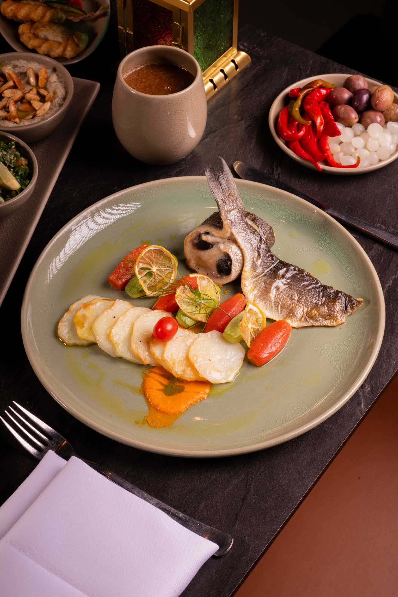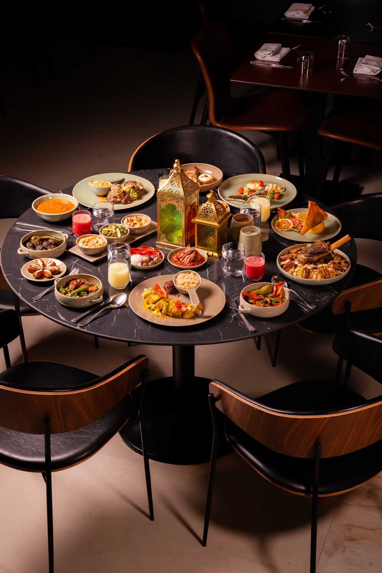 Des photos du restaurant ainsi que de l'expérience Iftar illustrent l'atmosphère chaleureuse et le cadre contemporain de l'établissement durant le mois de Ramadan.