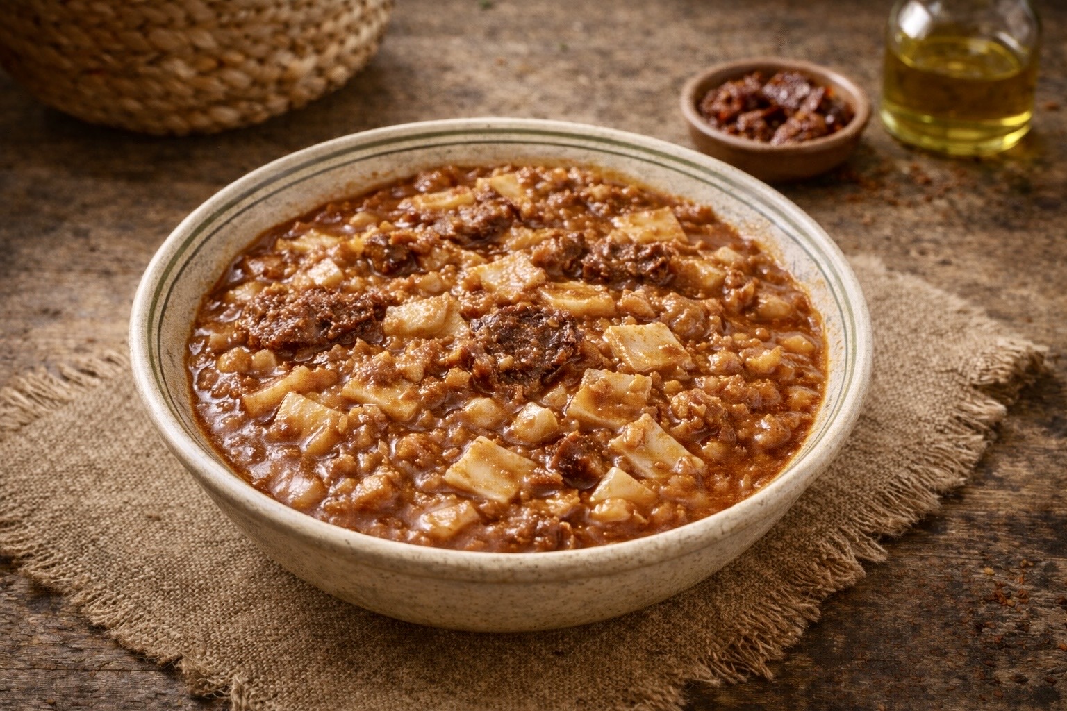 Le Phénomène "Mnechi" (منشي) : C'est le secret des Krabiz. La pâte crue est jetée directement dans la sauce bouillante. En cuisant, elle libère son amidon naturel, liant le bouillon pour créer une texture onctueuse, veloutée, presque crémeuse, sans aucun ajout artificiel.