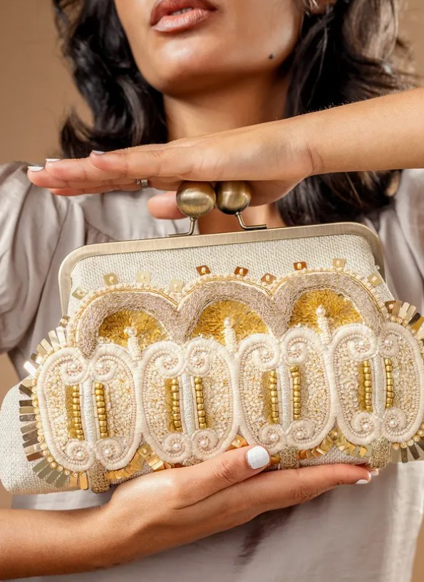 Minaudières et pochettes brodées inspirées des carreaux anciens en céramique tunisienne.